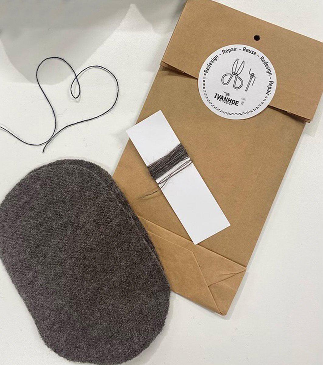 Reparationskit med brun papperspåse märkt med "Repair – Reuse – Reduce", svart tråd formad som ett hjärta, garnprov och en bit mörkgrå ull på vit bakgrund.