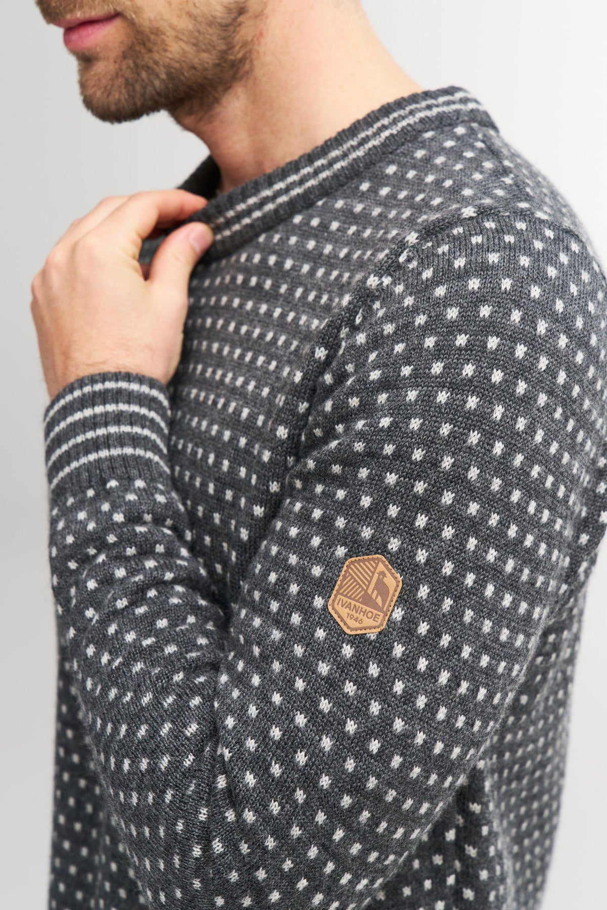 En tidlös klassiker stickad i 100% ull, där ullen är mulesingfri och garnet Bluesign®-certifierat. Accentfärg i mönster samt i ränder på mudd i hals och nertill på ärm och body. Upptill på vänster ärm sitter vårt logomärke i jacron, ett material som ser ut läder, men som i själva verket är gjort av papper.