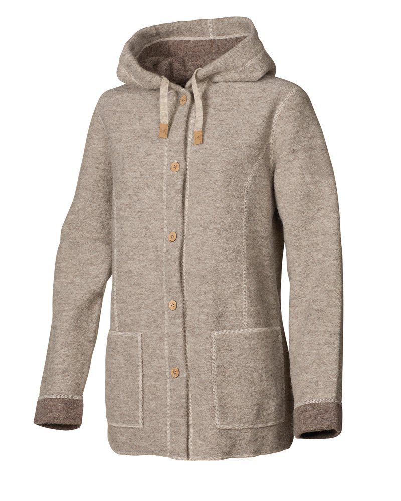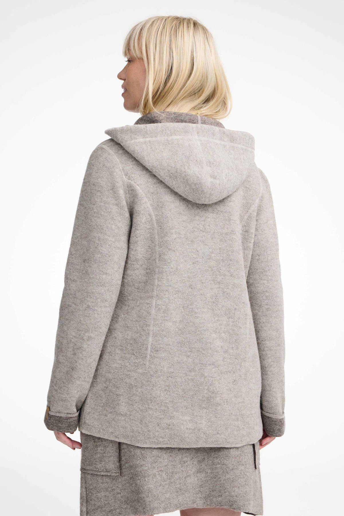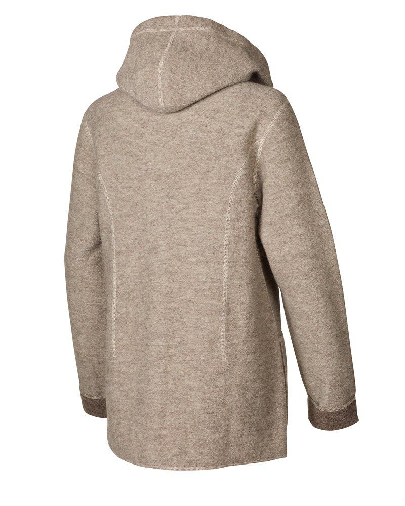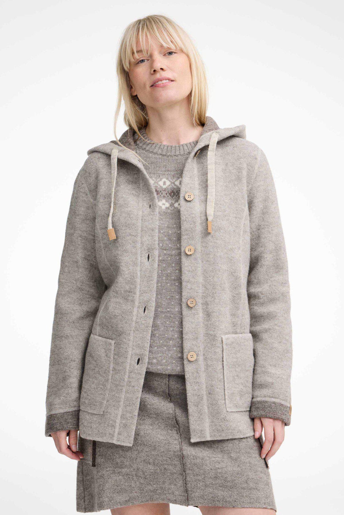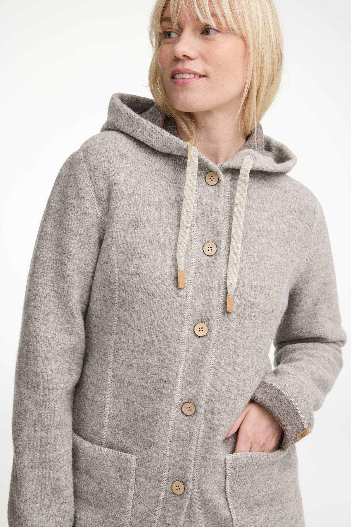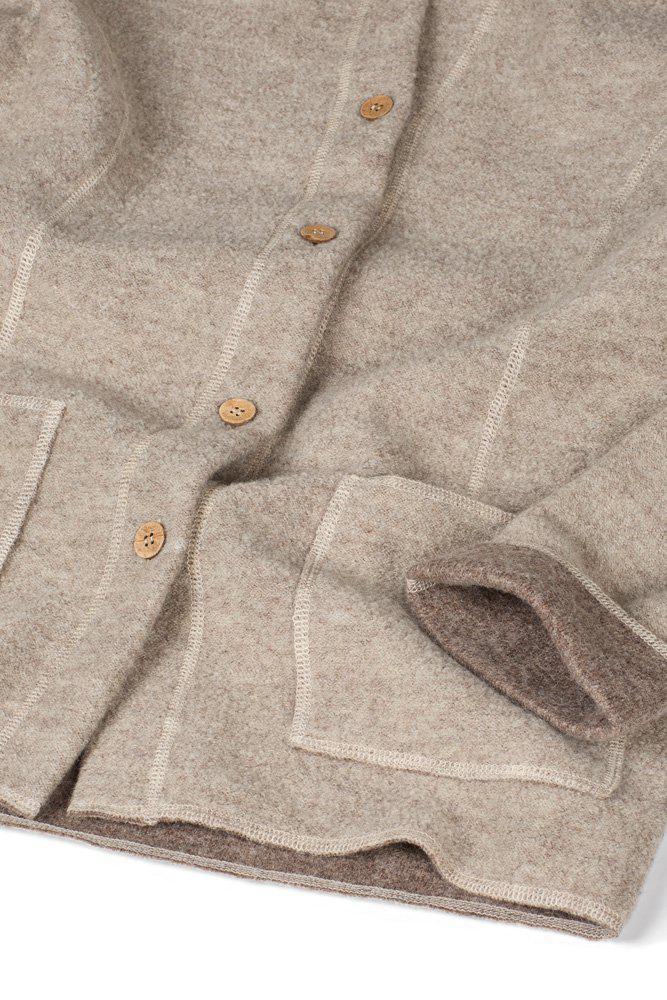 Die perfekte Frühlingsjacke! Sie lässt sich leicht mitnehmen und eignet sich für den Waldspaziergang genauso gut wie für den Einkaufsbummel. Die Jacke ist in unserer einzigartigen gewalkten Wollqualität hergestellt, gestrickt aus 100% ungefärbter ohne Zusatz von Chemikalien oder Farbstoffen. Die Knöpfe an der Vorderseite sind aus Kokosnussschalen gefertigt und daher alle einzigartig in Farbe und Struktur. Die Jacke hat eine Kapuze mit gestrickten Kordeln, großzügige Seitentaschen und einen Logo-Badge aus Jacron am linken Ärmel.
