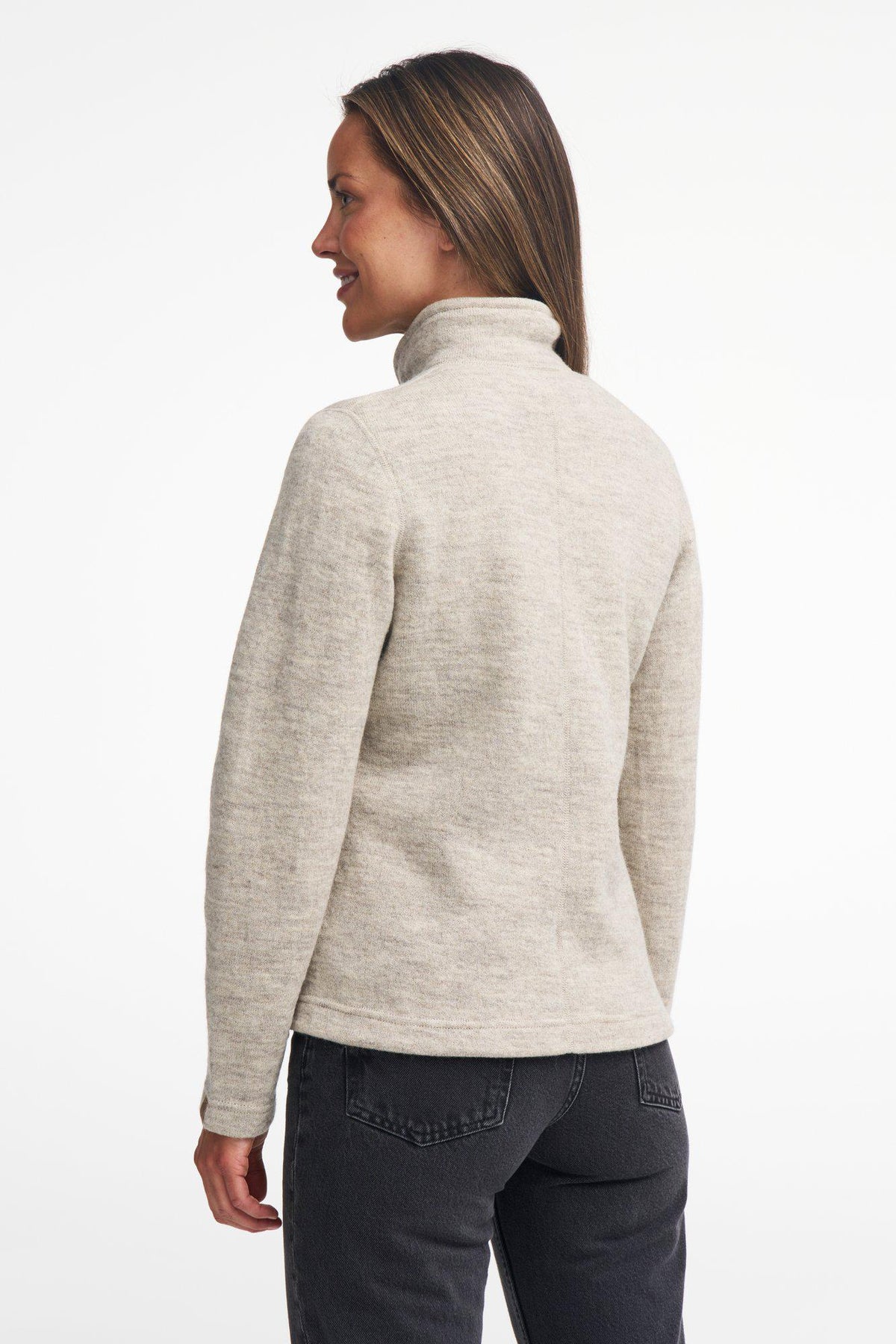Jacke mit durchgehendem Frontreißverschluss und seitlichen Reißverschlusstaschen. Die Jacke ist aus einem natürlichen Wollgarn gestrickt, das weder gefärbt noch chemisch behandelt wurde. Bei ihr wird die sonst innen liegende Seite nach außen getragen und sie unterscheidet sich deshalb von unseren anderen Jacken aus gewalkter Wolle. Logo-Badge aus Jacron am linken Oberarm und Reißverschluss-Puller aus Jacron.