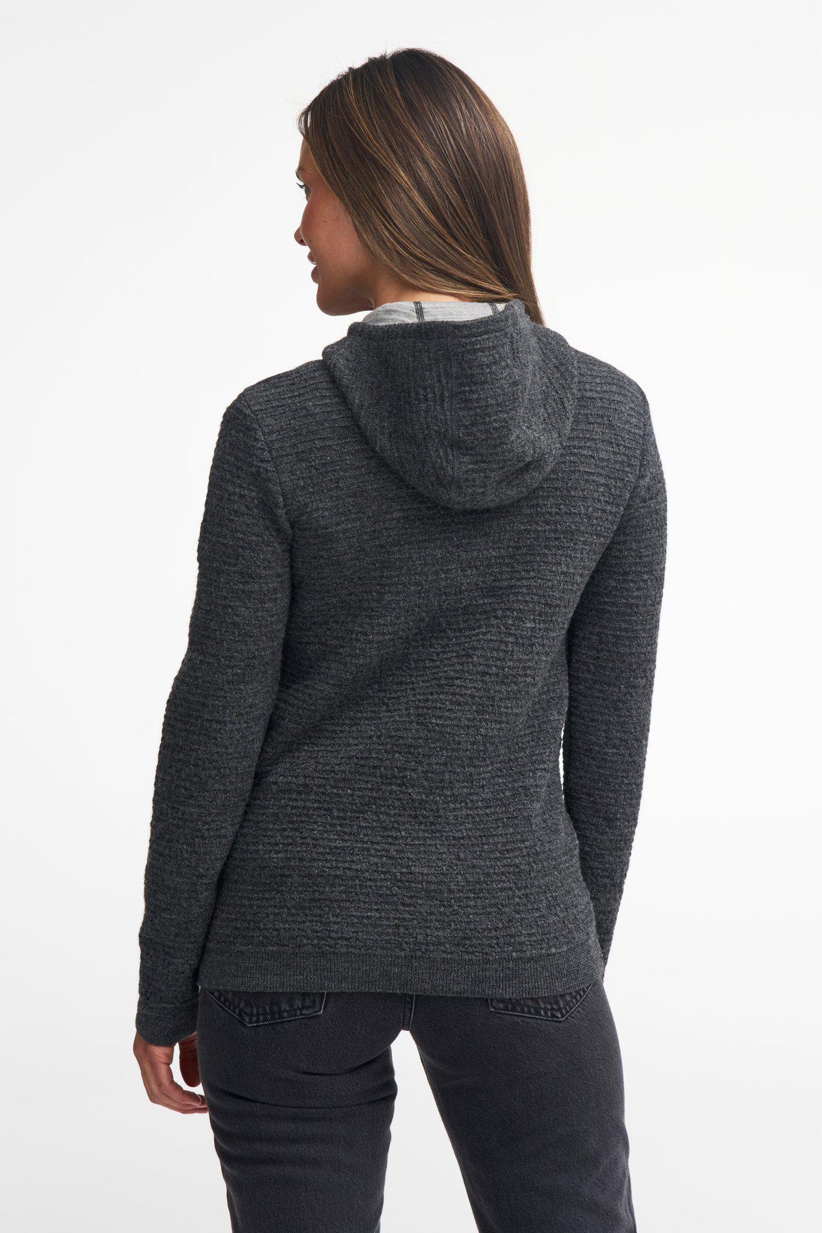 Morel hood female - Kapuzenjacke in einem 3D-Strick mit TENCEL® am Körper und 100% Wolle an der Außenseite. Die beim Stricken entstandenen Lufttaschen sind funktionell und verleihen einen einzigartigen Ausdruck. Rippstrickbündchen unten am Körper und an den Armabschlüssen. Mit Logo-Badge am linken Oberarm und unseren Jacron-Reißverschlusspullern vorne und an den seitlichen Taschen.
