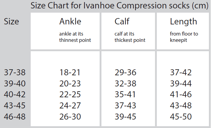 IVANHOE COMPRESSION SOCKS sind spezielle Strümpfe, die dazu beitragen sollen, das Auftreten von Venenerkrankungen wie Ödemen, Venenentzündungen und Thrombosen zu verhindern und deren Fortschreiten vorzubeugen. Es gibt 4 Hauptkompressionsstufen, die in Millimeter Quecksilber (mmHg) gemessen werden. Je höher die Zahl, desto höher ist die Kompression. Unsere Kompressionsstrümpfe gehören zur Kompressionsklasse 1 mit 15-21 mm Hg: Stützstrümpfe, Flugsocken, Sportkompressionssocken. Erhältlich in den Größen: 37-38, 39-40, 41-42,43-45