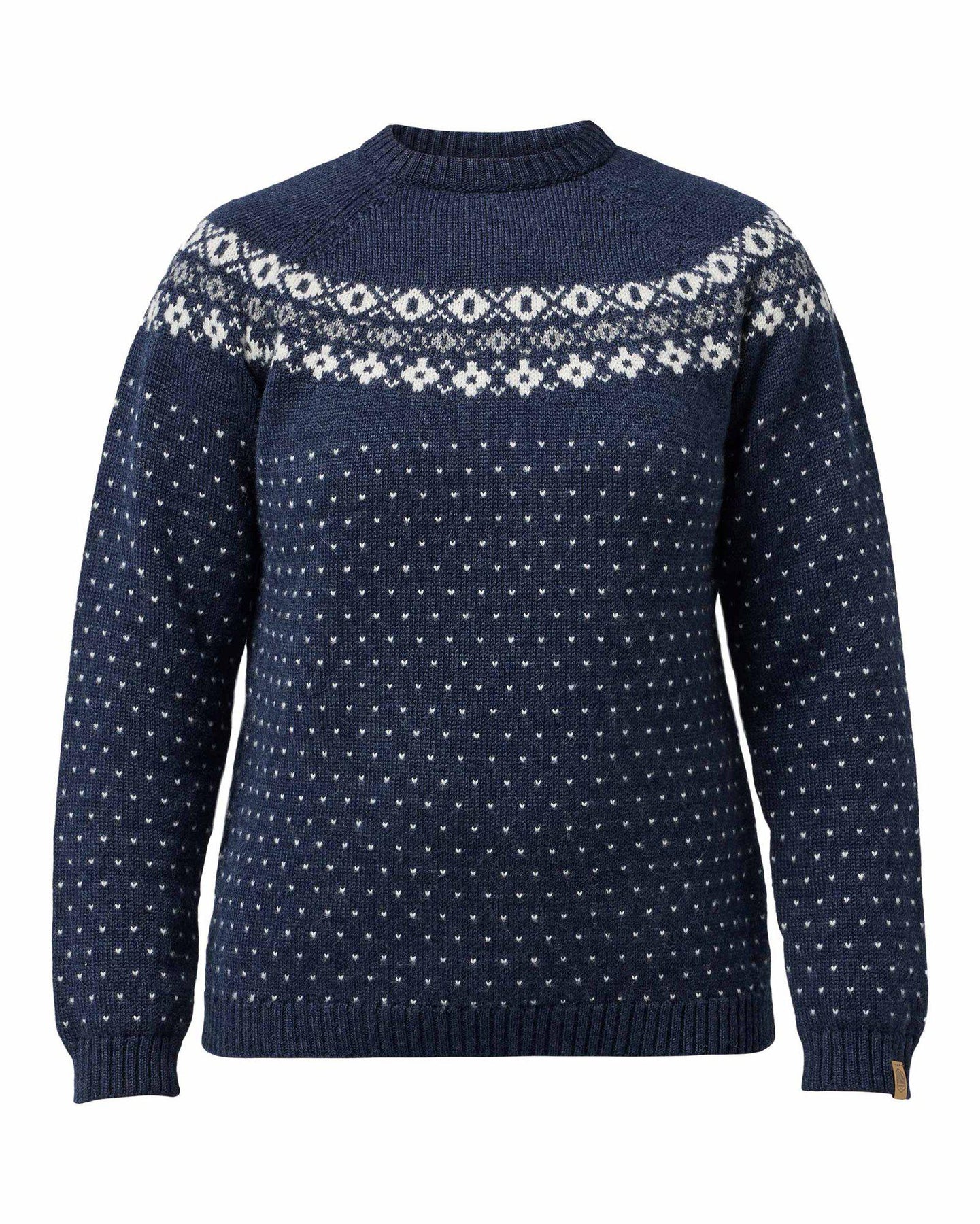 Klassischer Crewneck-Stil mit folkloristisch inspiriertem Muster. Aus 100 % Wolle gestrickt und mit Sicherheit ein langjähriges Lieblingsstück! Kleines Logo-Badge in Jacron am unteren linken Ärmel.