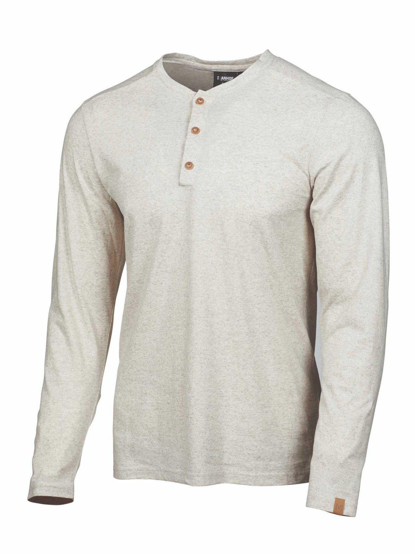 Langarm-Henley aus superbequemen Material mit Slub-Effekt. Drei Holzknöpfe auf der Vorderseite und ein kleiner Logo-Badge aus Jacron unten am linken Ärmel.