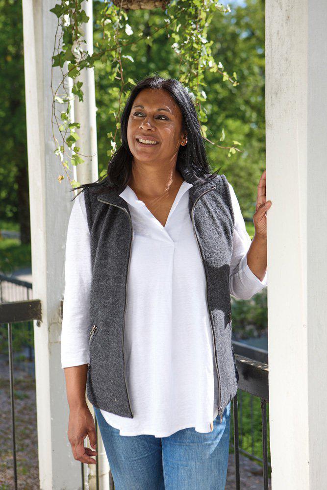 Flora vest - This full zip vest with zipped seitliche Taschen have a classic and timeless design and is knitted in a mixture of wool and TENCEL®. Material is plated with TENCEL® closest to body, which gives a softer and cooler feeling against the skin.