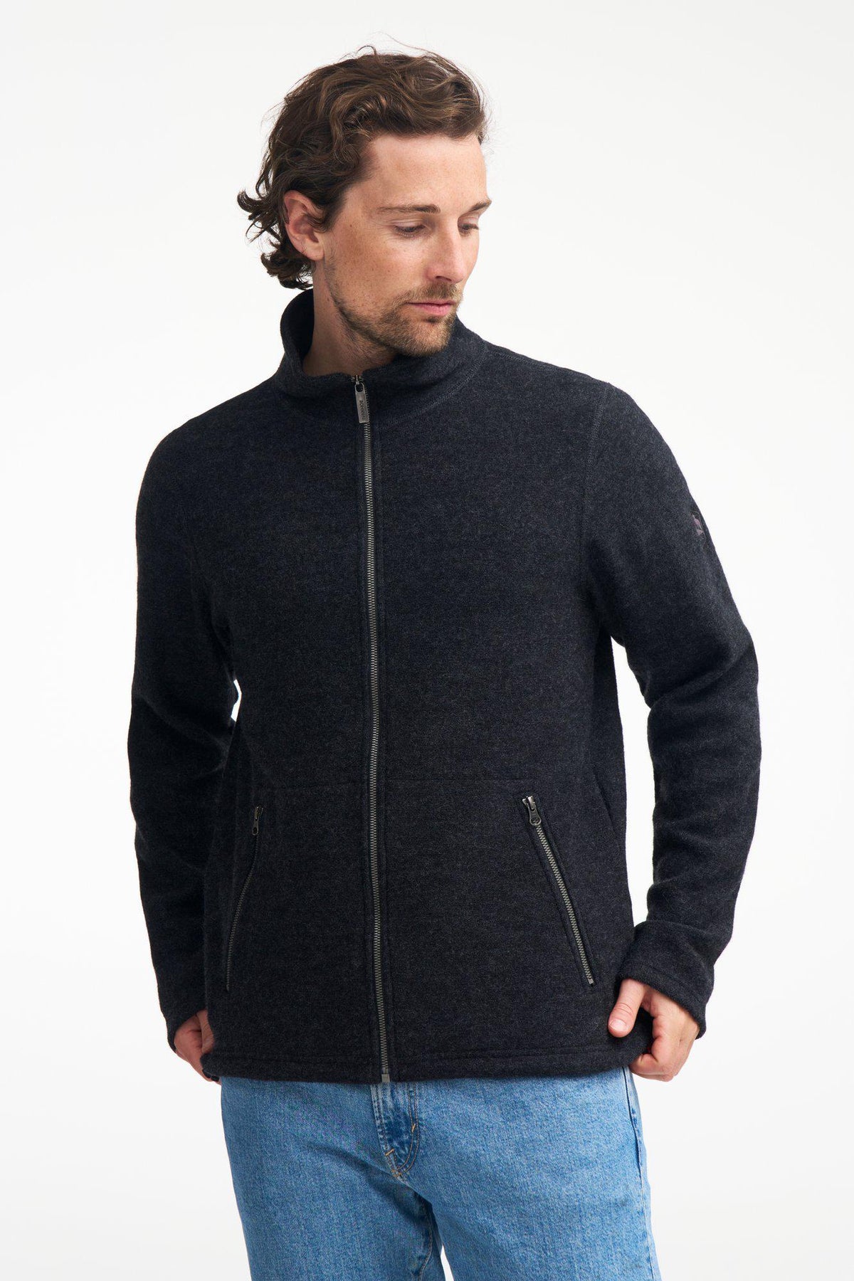 Bruno full zip - Diese klassische Jacke mit durchgehendem Reißverschluss ist aus unserer dünneren, kühleren und weicheren gewalkten Wollqualität mit körpernahem TENCEL® gestrickt. Seitliche Reißverschlusstaschen und Logo-Stickerei am linken Oberarm.